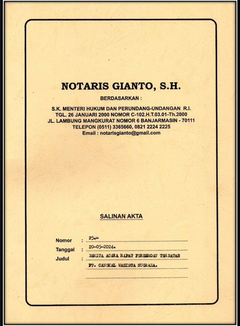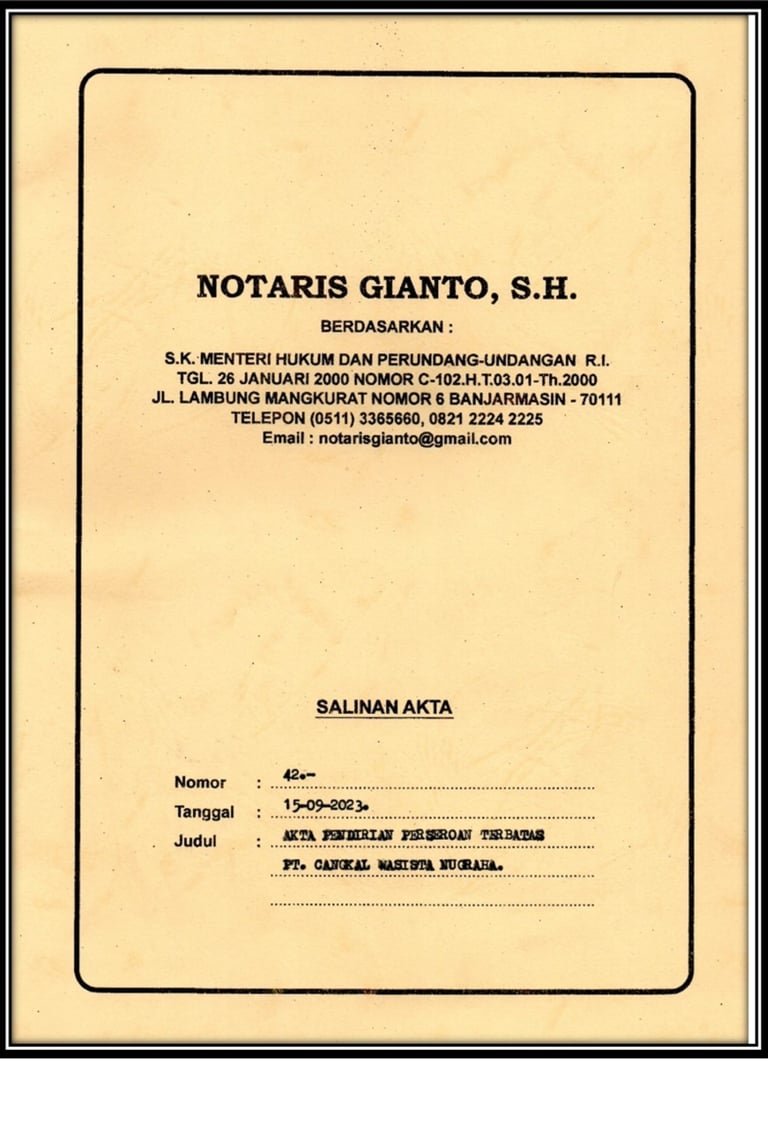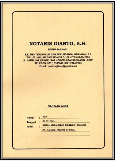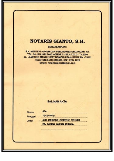 Sebagai bukti resmi dari perjanjian pendirian dalam perusahaan kami, yang telah disahkan oleh Notaris, memuat informasi penting tentang pihak-pihak yang terlibat dan syarat-syarat perjanjian sebagai pendukung legalitas dan kejelasan dalam menjalankan kegiatan usaha, serta melindungi hak dan kewajiban masing-masing pihak.